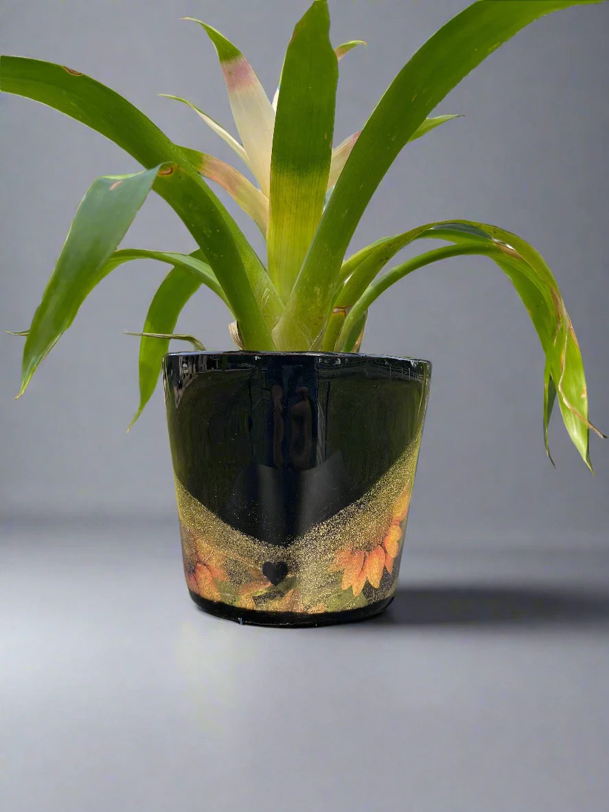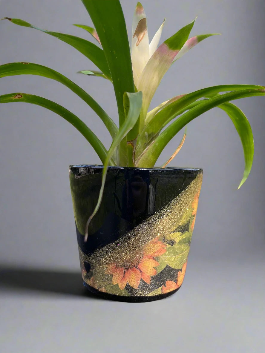 Each hand-crafted terracotta pot is labored with hours of love. The pots are in a decoupage style and layered in a variety of mediums including waterproofing sealant, epoxy resin, modge podge, vinyl, glitter, and acrylic. It takes several days to apply all layers and to create the best product possible. Each one is slightly unique. Minor imperfections are to be expected and adds to the whimsical nature of a handmade piece.